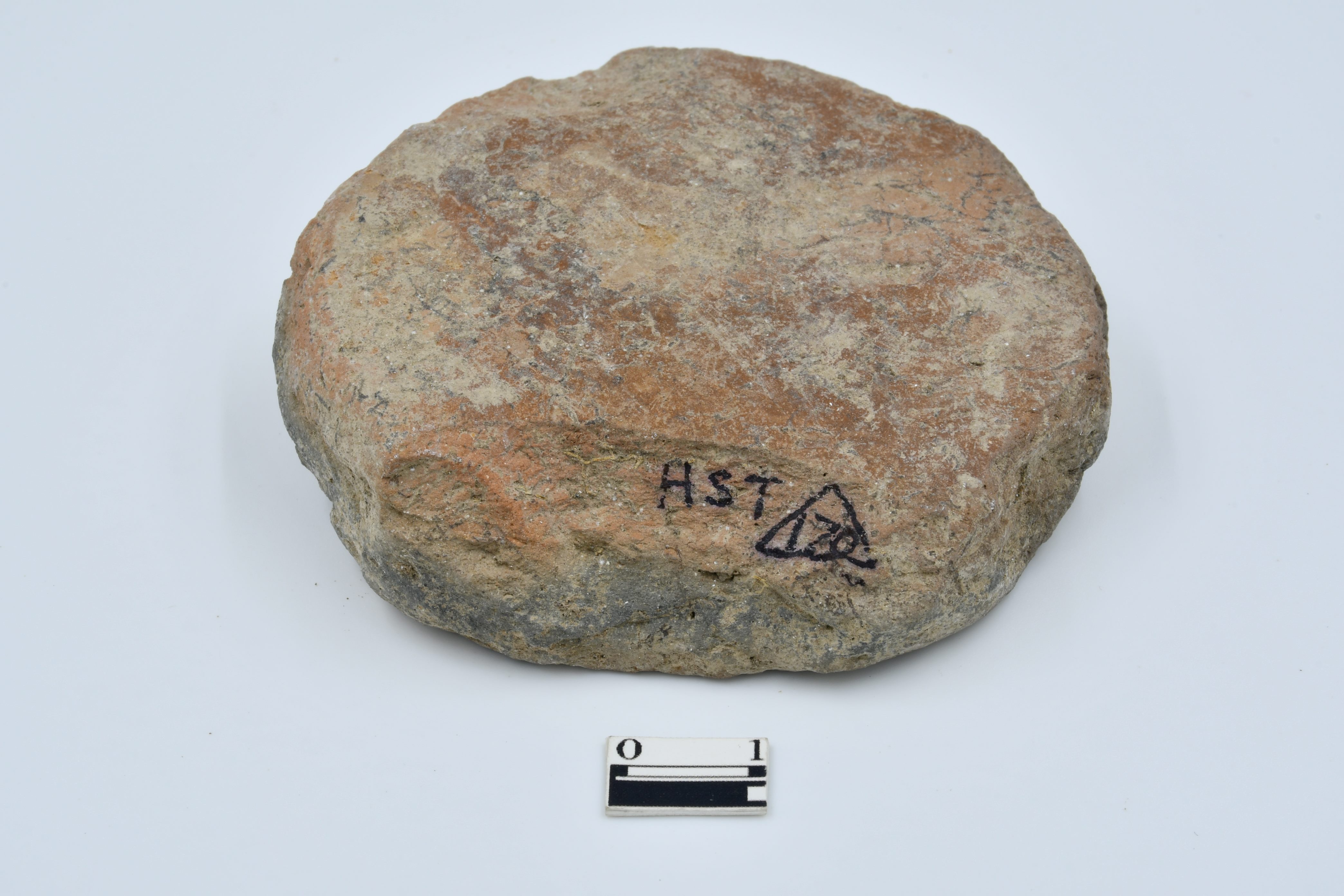 Semi oxidised pottery disc, partially broken, chipped on outerr surface