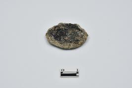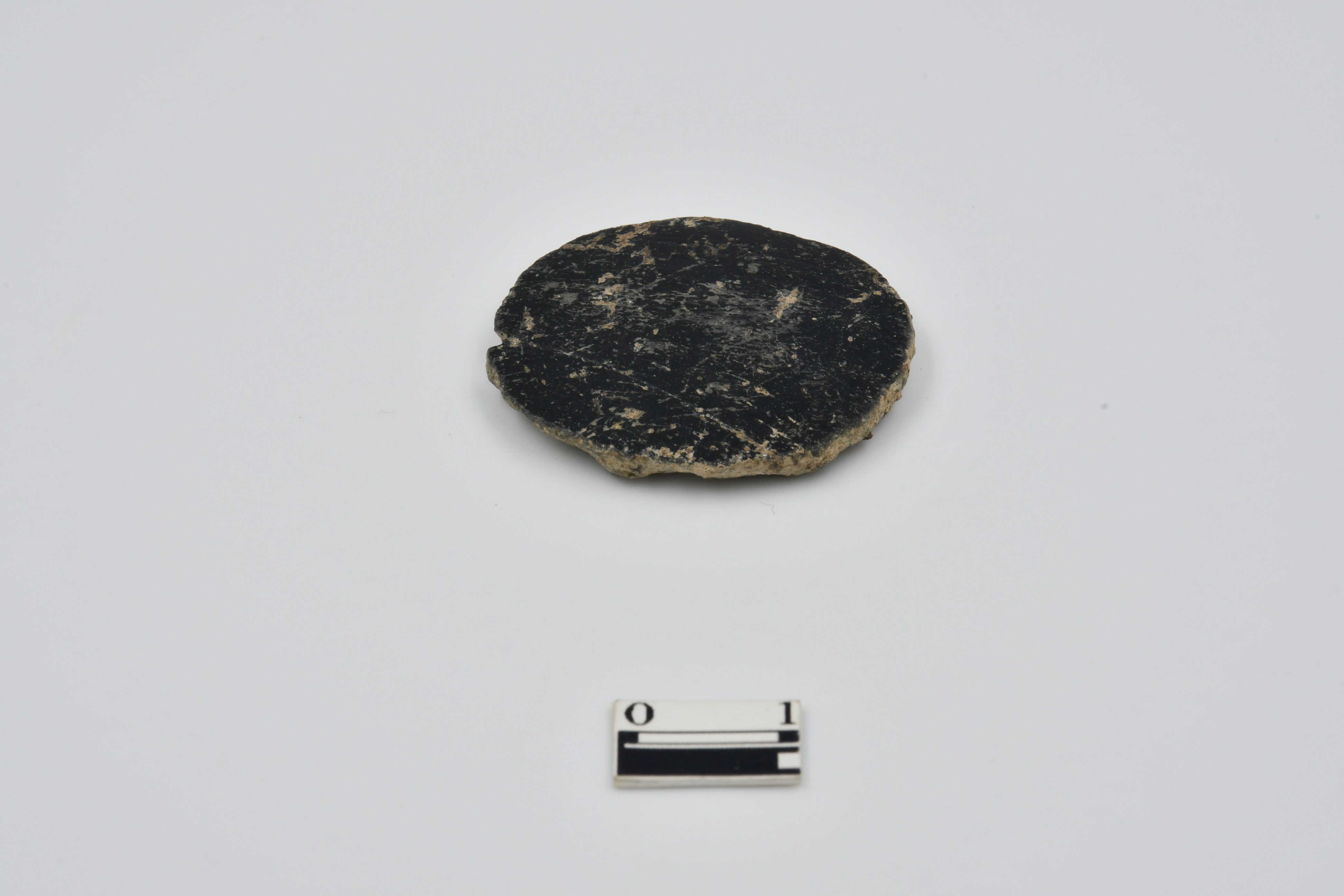 Terracotta disc made of Black ware potsherd, edges are chipped black in color, one side has rough surface