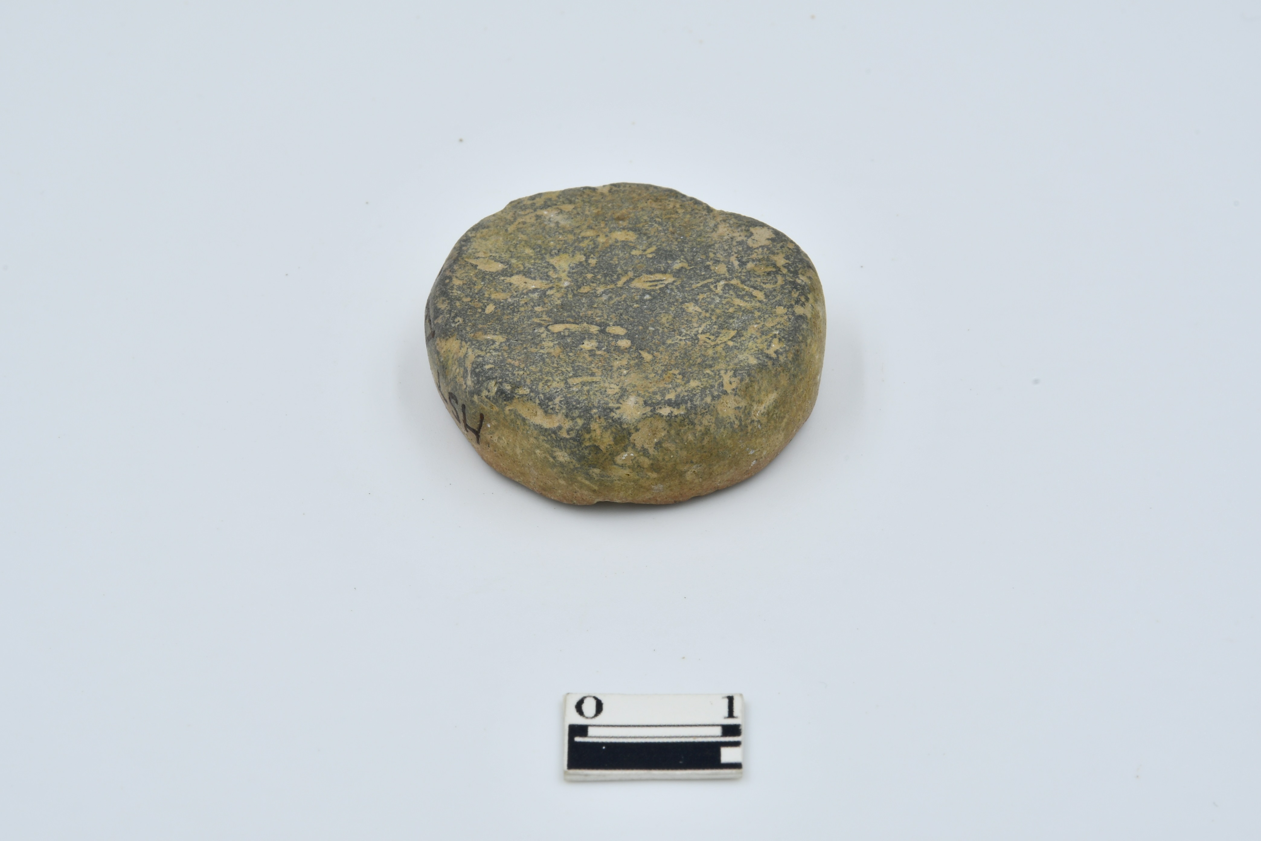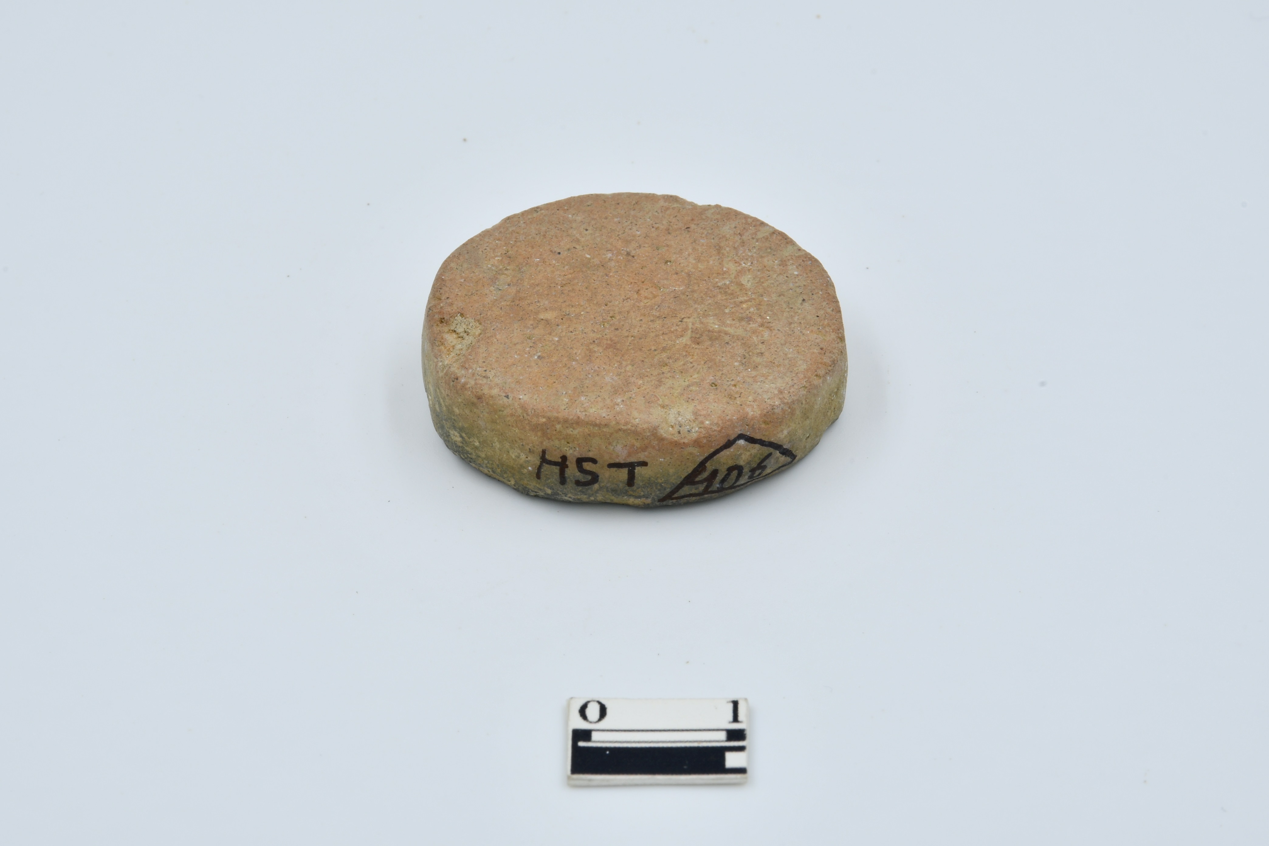 Circular shaape terracotta disc. semi moxidised, chipped on the edges, one side is red and other is black.