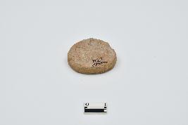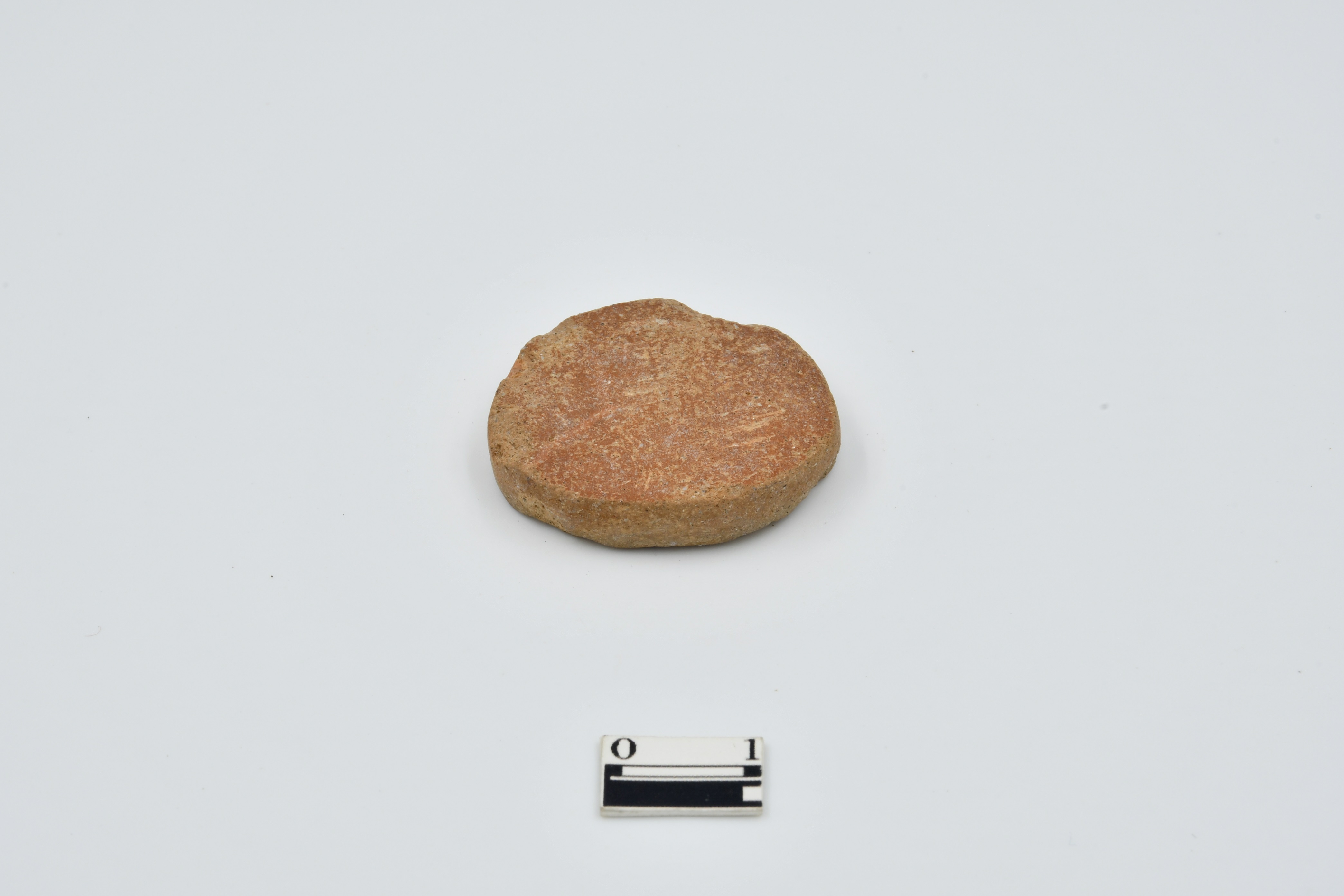 Terracotta disc mad of red ware pottery, Smooth surface on one side, chipped on edges