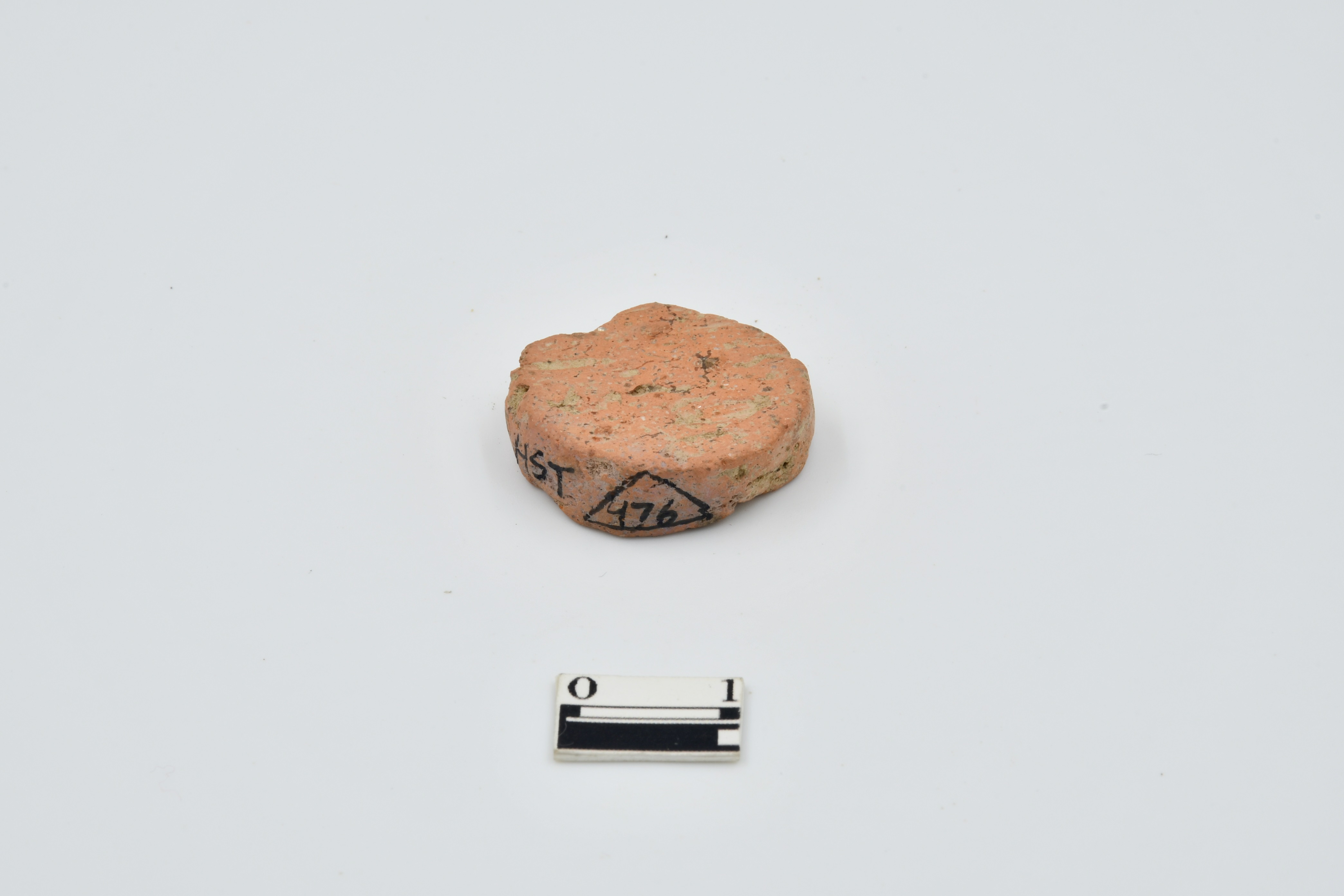 terracotta disc made of red ware pottery, light red in color, chipped on edges.