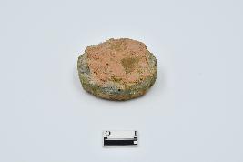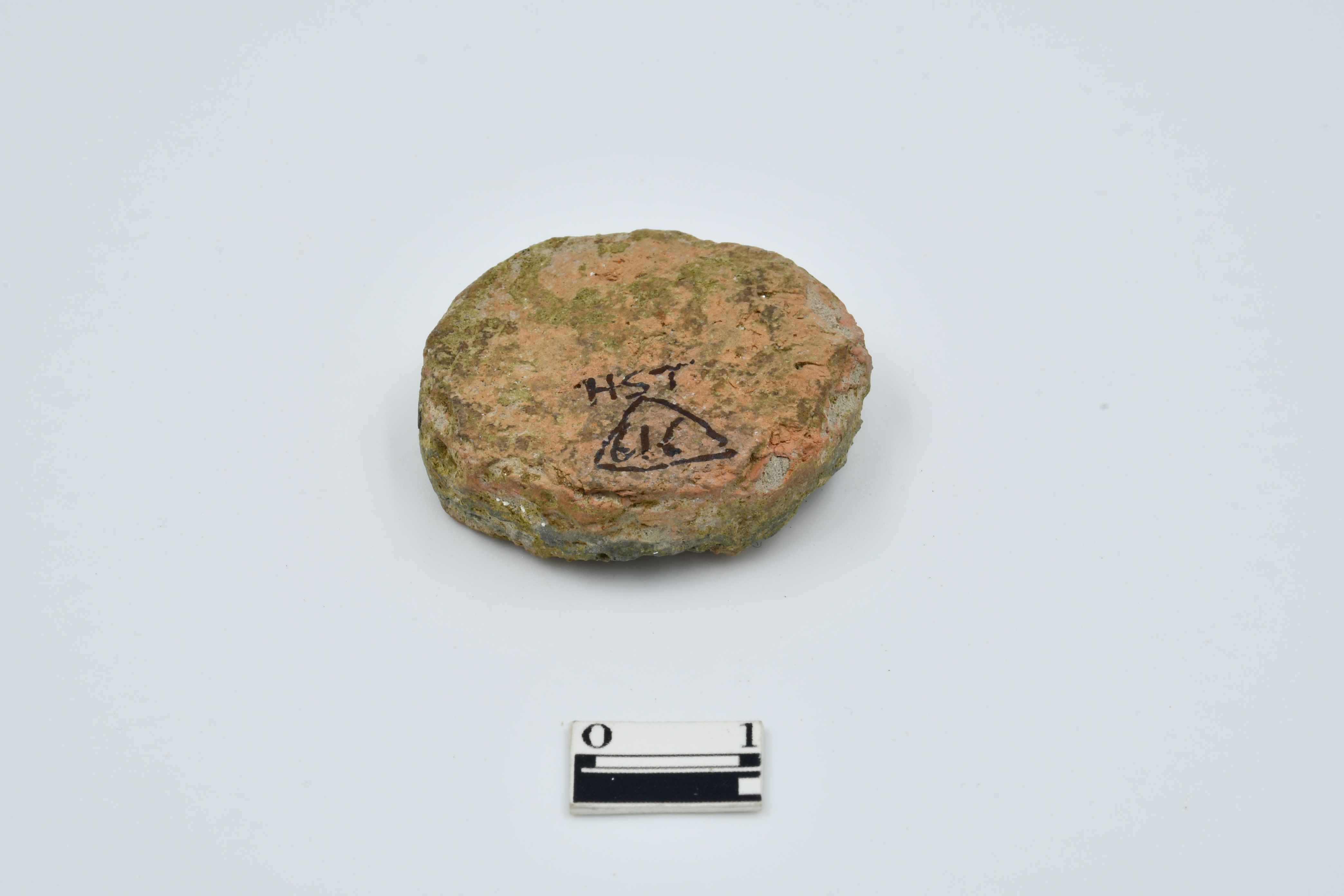 Terracotta disc made of red ware pottery, chipped off from edges, ill fired