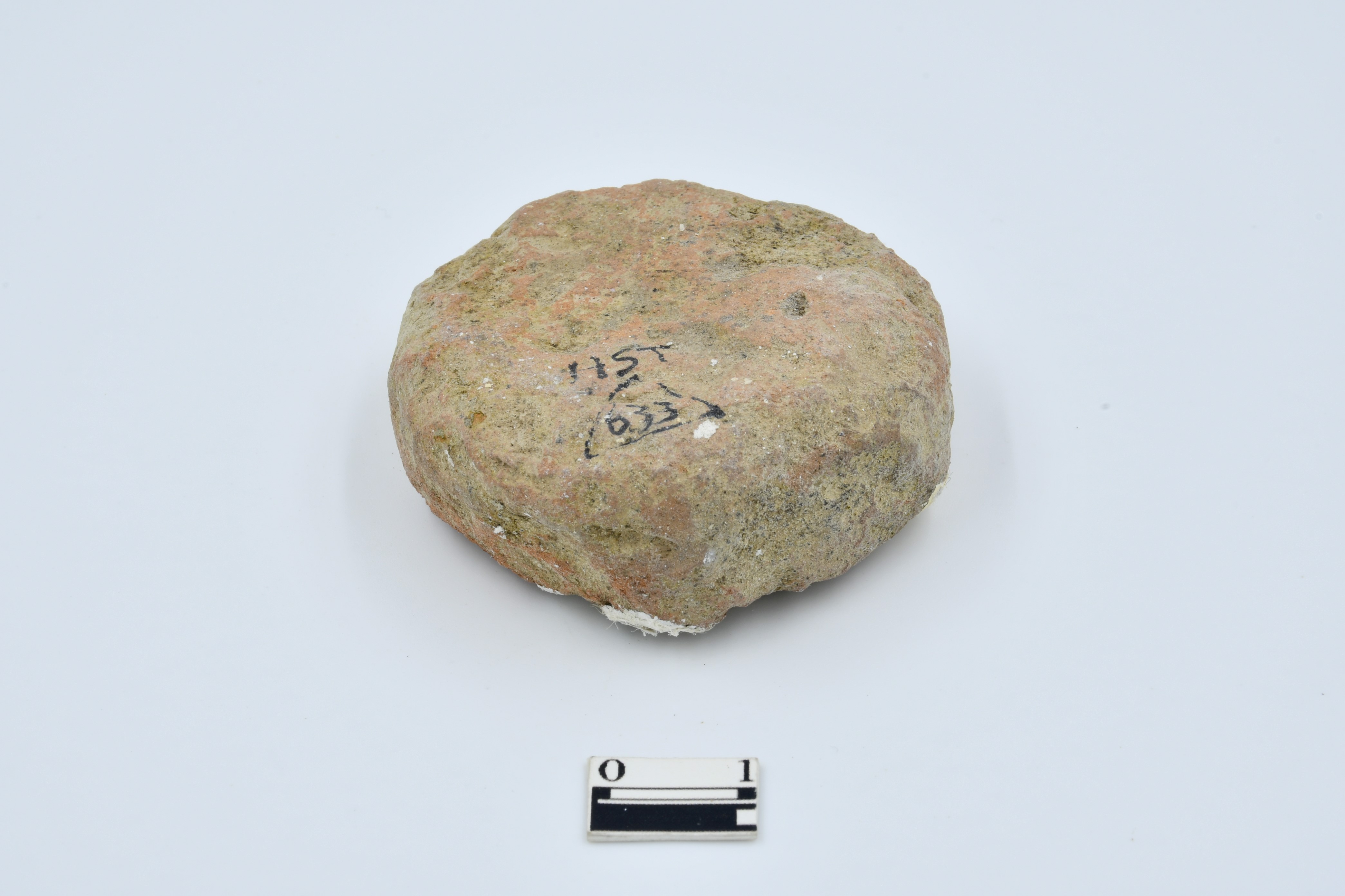 Terracotta disc made of red ware potsherd, rough surface and uneven in shape