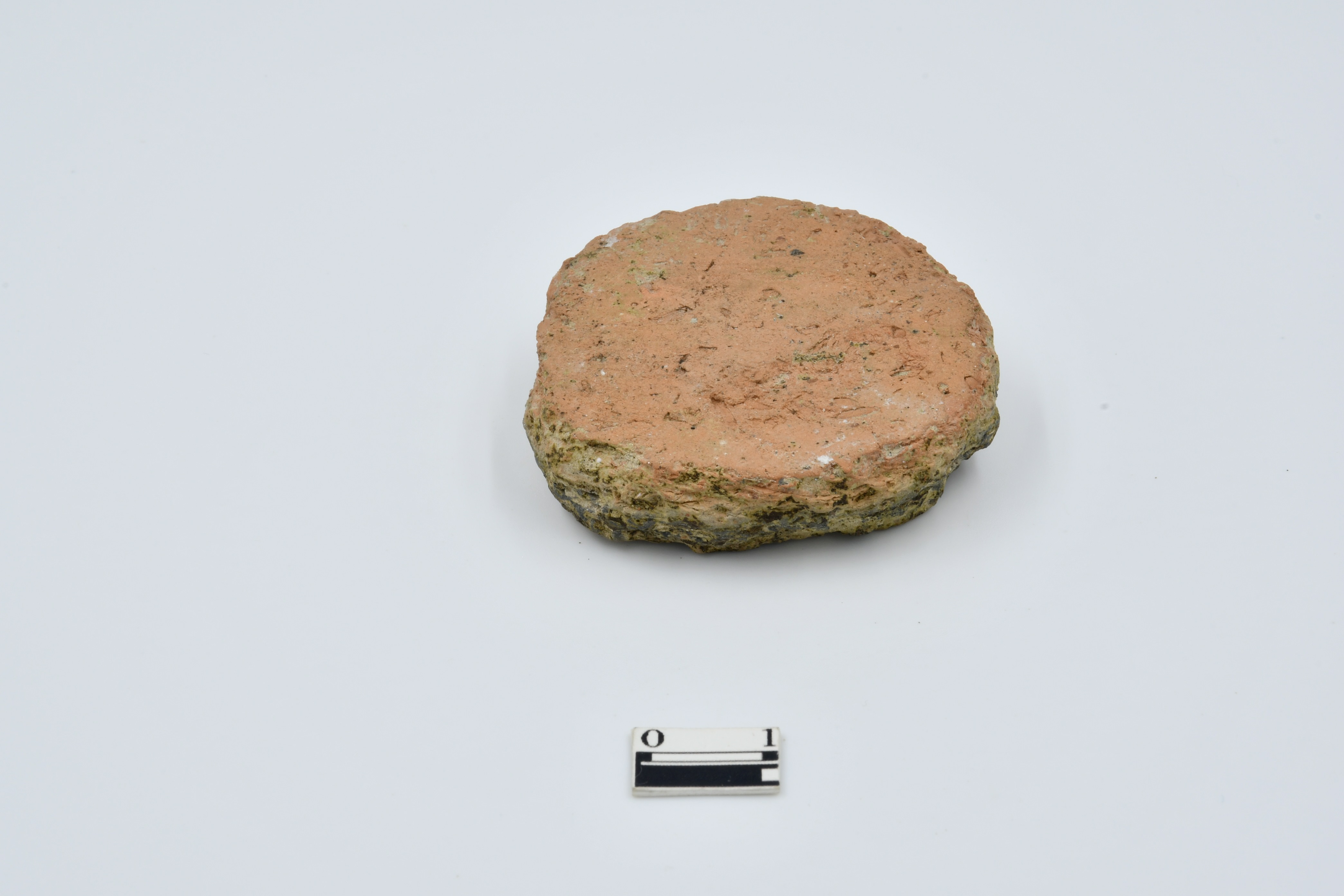 Terracotta disc made of red ware pottery, Rough surface, edges are chipped
