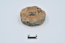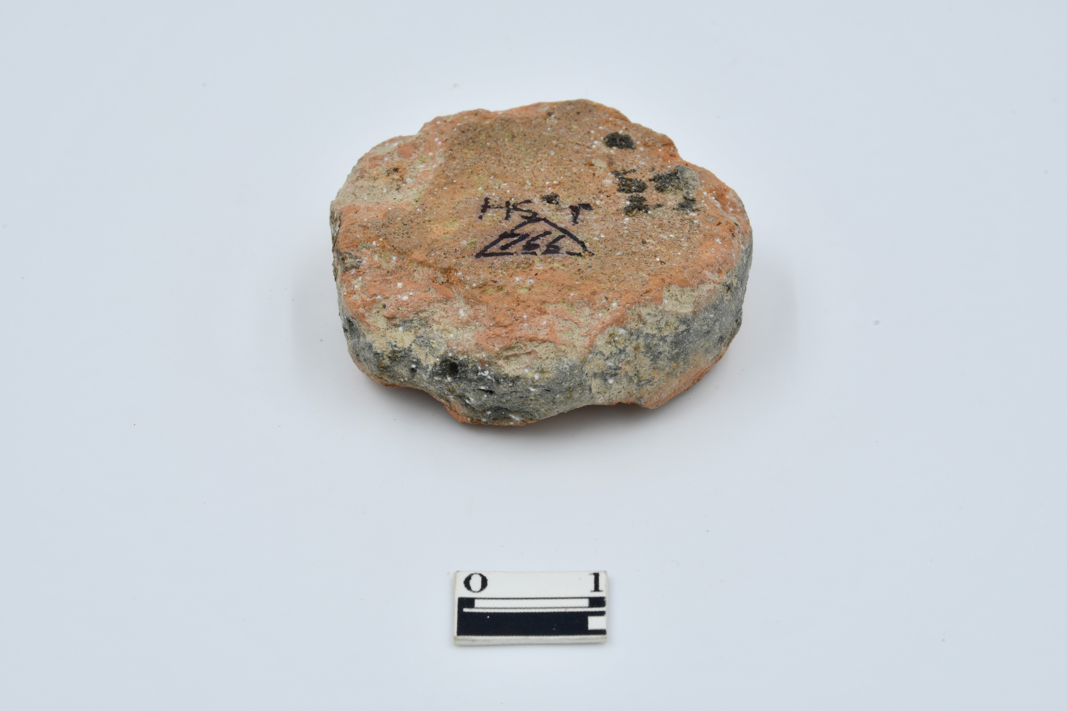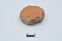 Terracotta disc made of red ware pottery , rough surface, ill fired, chipped from edgesQ