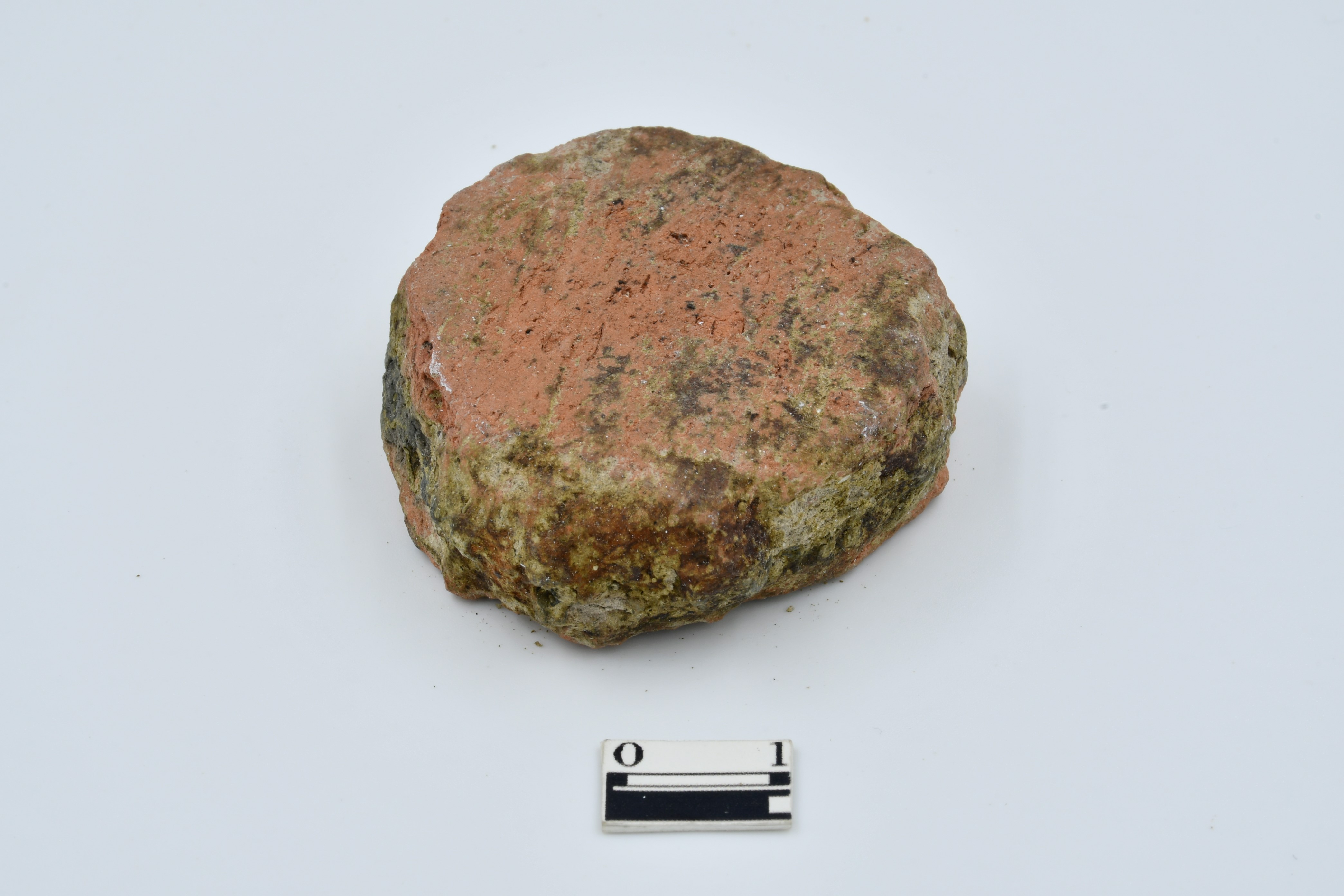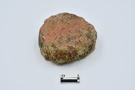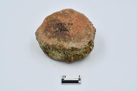 Terracotta disc made of red ware pottery, Rough surface, chipped from edges, section is black in color