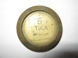 | Description / विवरण | This is a weight made of brass. In a central circular depression 5 TOLA, netweight English make is imprinted in four lines. Back sides of weight is having a tiny depression in center. |
