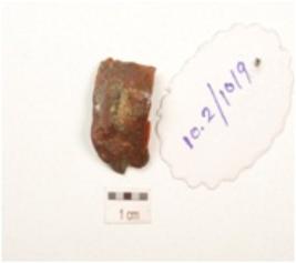 | Description / विवरण | Copper, indeterminate object, partly rectangular in shape broken from both ends, smooth surface with some projection on top, concave interior green incrustation marks and chemically treated. |