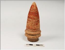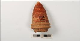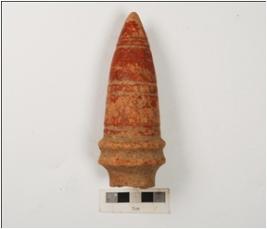 | Description / विवरण | Fragment of moulmade terracotta conical shaped knob, surface decorated with incised circular line at legular intervals, medium fabric surface treated with red slip, well backed. |