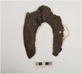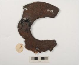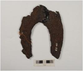 | Description / विवरण | Fragment of unidentified iron object, rough surface and two perforation on surface. |