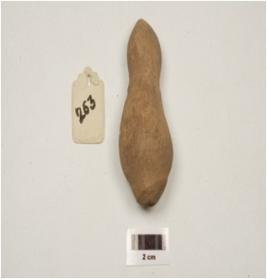 | Description / विवरण | A terracotta bullae with smooth surface, cylinder in shaped, partly globular body and conical at one end, well baked, fine fabric and chocolate in colour, circular in cross section. |