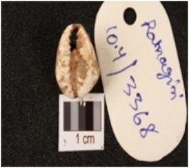 | Description / विवरण | A natural shell cowrie with a bulbous top, partly damaged upper side, powdery surface, groove on bottom and natural white in colour. |