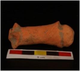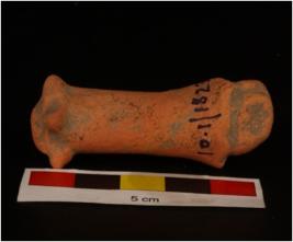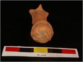 | Description / विवरण | Unidentified terracotta. cylindrical shaped object globular top flat base, circular projected design, with pinching method and wash treatment in dull red colour. |