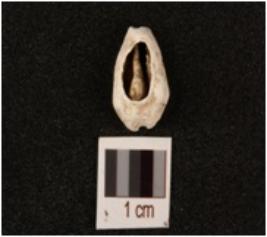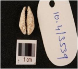 | Description / विवरण | Cowrie, natural marine shell, bulbous top surface broken, grooved line on bottom and powdery surface. |