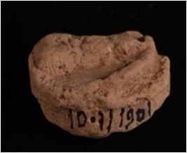 | Description / विवरण | Moulded terracotta medalliaon figure of deity both side, seated in posture, cruded, features are not clear, one side drappery is slightly visible, floral design on pedestal, circular in shape and trident is visible. |