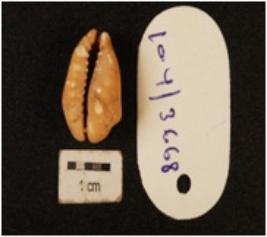| Description / विवरण | Cowrie, shell object with polished surface and natural groove line at base, cream in colour. |