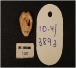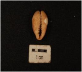 | Description / विवरण | A cowrie shell natural marine object with groove, powdery surface, exterior surface is damaged and white in colour. |