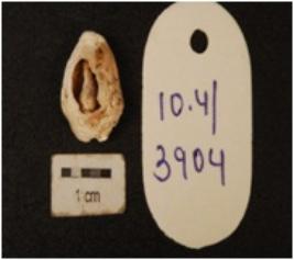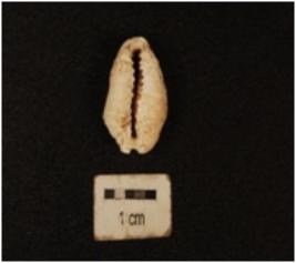 | Description / विवरण | A cowrie shell natural marine object with groove, powdery surface, white in colour and exterior surface is damaged. |