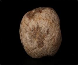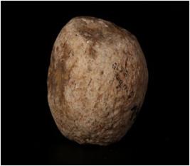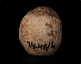 | Description / विवरण | Stone sling ball with rough surface, slightly broken from surface. |