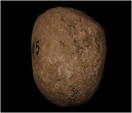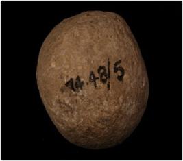 | Description / विवरण | Stone sling ball, in spherical shape, made by quartzite and rough surface. |