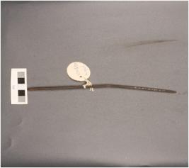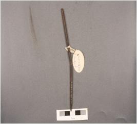 | Description / विवरण | A copper pin with round section, pointed at one end, other end bulbous, slightly bend, smooth surface. |
