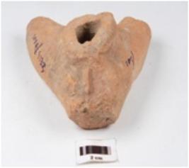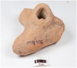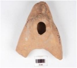 | Description / विवरण | An arrow shaped terracotta stand, base portion is present, broken and missing upper portion, all the angles are partly broken, surface treated with red wash and well baked. |