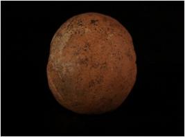 | Description / विवरण | Handmade terracotta sling ball, circular shape with surface has wash treatment in red colour and grooved lines on top. |