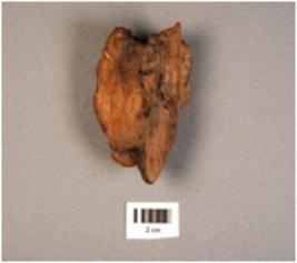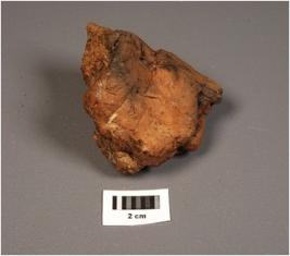 | Description / विवरण | Unidentified iron object, looking burnt, uneven in shape, depressed from one side, improper edges, rough surface, rusted. |