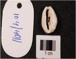 | Description / विवरण | A cowrie shell, a natural marine object, with natural groove, powdery surface. |