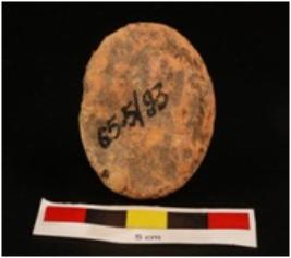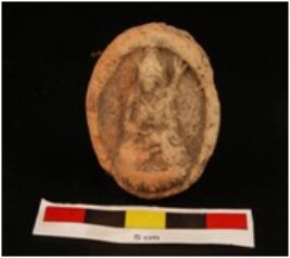 | Description / विवरण | Moulded medallian in circular shape with seated figure of human on platform, crown on head, right hand placed on chest and left hand is holding drapery. Seated in padmasana mudra. |