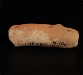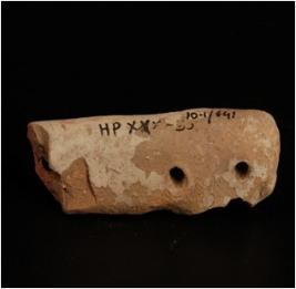 | Description / विवरण | Fragment of handmade terracotta toy cart frame, rectangular in shape with 3 perforations. Well levigated clay, ill fired with traces of slip in buff. |