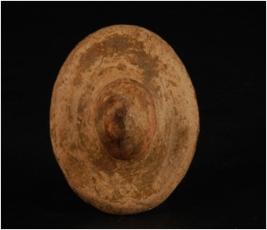 | Description / विवरण | Wheel turned terracotta lid with conical knob on top, striation mark on base and body, traces of dark red slip. |