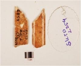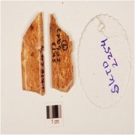 | Description / विवरण | Unidentified bone object, polished surface thin cross section, broken, one side flat and other side convex and porous interior. |