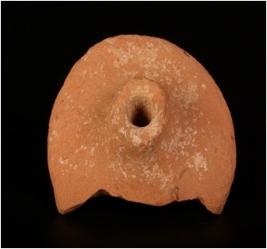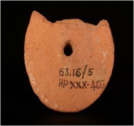 | Description / विवरण | A terracotta wheel with perforation in the centre. It has a flat surface. Applied with wash treatment on it and one side broken. Have bulging hub. |
