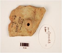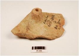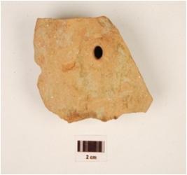 | Description / विवरण | A fragment of a hubbed wheel, raised hubbed portion intact, fine fabric, visible mica particles, perforated, broken discular edge. |