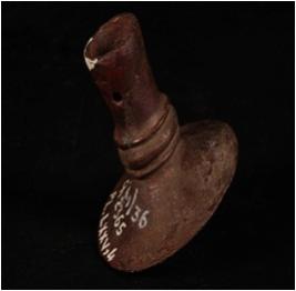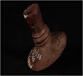 | Description / विवरण | Copper stamp, circular base, cylinderical holder, flat circular top, hollow with circular ring, corroded. |