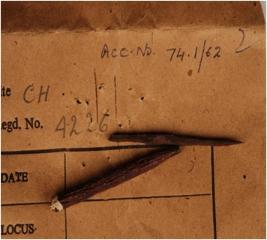 | Description / विवरण | Copper pin, which is broken in two piece, pointed ends and corroded surface. |