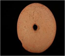 | Description / विवरण | Handmade terracotta wheel, moulded long knob, perforated round in shape, edges are slightly chipped off, thin in character, red in colour. |