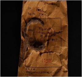 | Description / विवरण | Iron door ring, round in shape but partly broken, jointed nail with pointed end, rusted. |