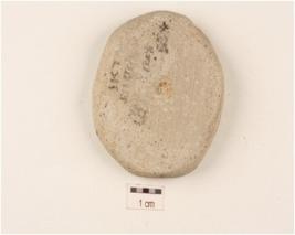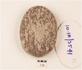 | Description / विवरण | A wheel made terracotta spindle whorl, uneven edges, depression in the center, made with fine fabric, well baked, one side has red slip treatment with black paintings on it. |