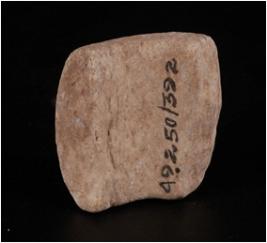 | Description / विवरण | Fragment of broien piece of a solid wheel made on steatite. Rectangular in shape, smooth surface, and partly broken. |