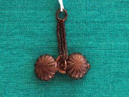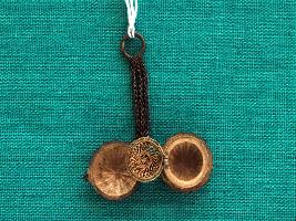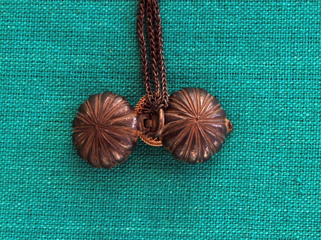 A small circular box in the form of an amulet. The box is beautifully designed with line designs and deposition of dust, dirt and soft patina is visible.