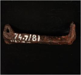 | Description / विवरण | Iron clamp square section with curved end, segmented sections, hole is visible because of curve. Rusted. |
