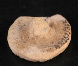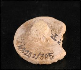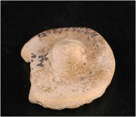 | Description / विवरण | A steatite steatite stamp with a small broken handle treated with red wash. The bottom has semicircular and square groove designs. its borders has linear groove designs. |