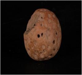 | Description / विवरण | Handmade terracotta object of sling ball, made on well lavigated clay, ill fired, red in colour, decorated with pin size holes on surface, and partly broken. |