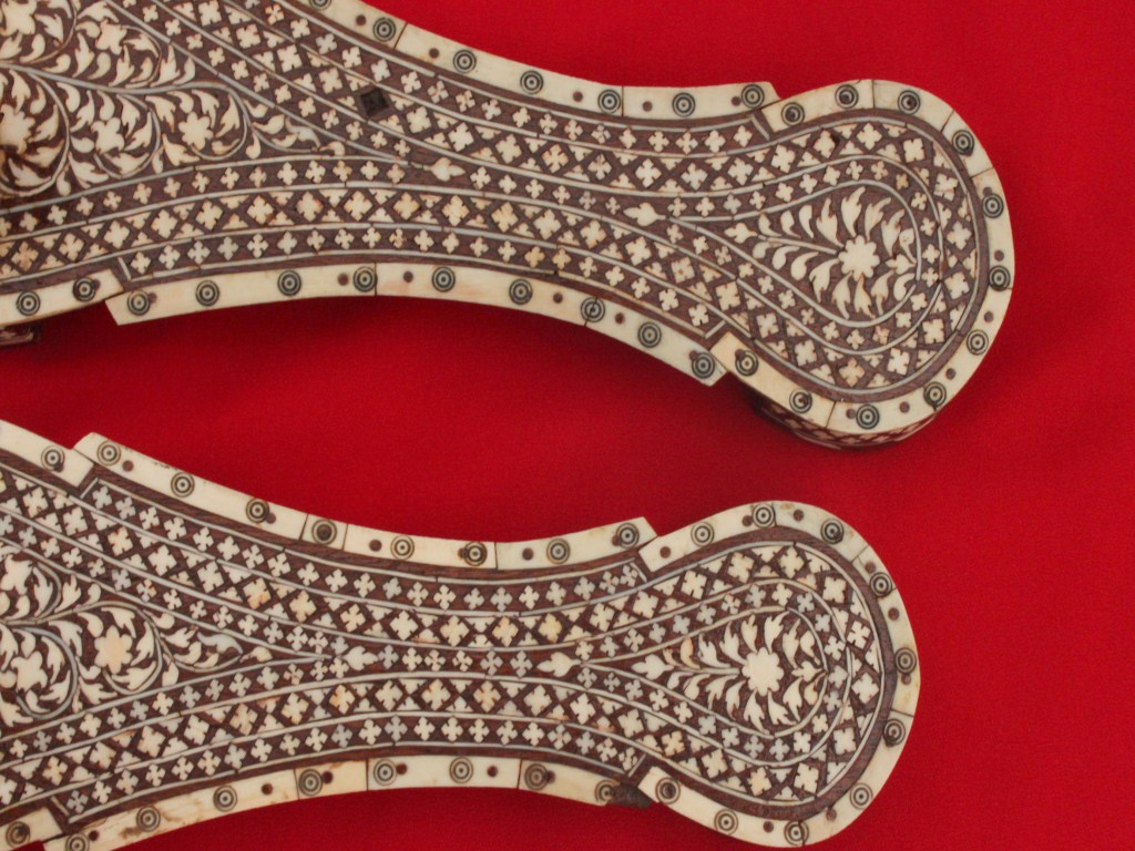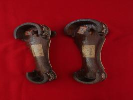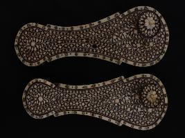 A pari of footwear with ivory inlay work in it. The khadao is decorated with ivory pieces stuck in floral deisgn. The holder of one piece is damaged.