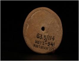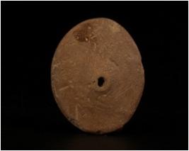 | Description / विवरण | A terracotta wheel with convex surface and peroration in the middle. |