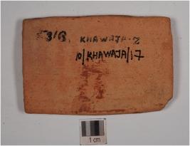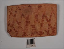 | Description / विवरण | A indeterminate object of dull red ware, treated with red slip on the exterior, and painted with criss-cross pattern enclosed in two horizontal band in red pigment and it is rectangular in shape. |