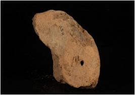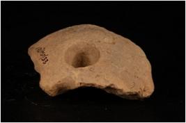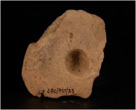 | Description / विवरण | A fragment of terracotta probably a piece of cake. Half part is broken and one hole on the surface. |