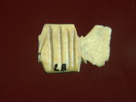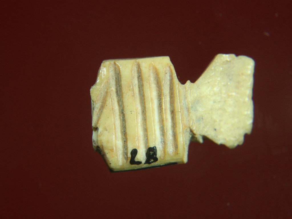 Trench ZA-9, LxB-D, ZA10-3 mts -ZB10- 5 mts- 3.90 mts below peg ZA9, Stratum-Pit no.5 s by layer 17. It is an unidentified object, made up of ivory, light brown in colour, smooth surface and a design of linear parallel lines on both sides.